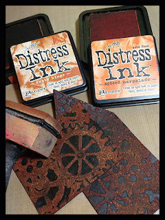 Use an Ink Blending Tool to rub bright colors of Distress Ink onto the sanded surfaces. I used Rusty Hinge and Spiced Marmalade.