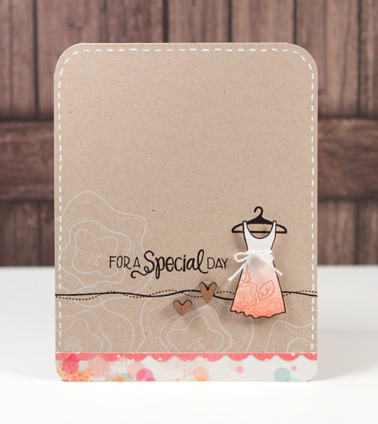 I’ve created a couple cards to show the card kit (two more will be here on the blog soon–with videos, too!). It’s a super fun kit and I love all the different ways you can stamp the little dresses in the stamp set!