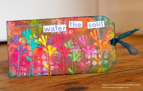 Sarah had this to say: Whilst I’m not so bothered about the real ones, I love flowers in all their crafty forms so when I started on this project I thought a field full of daisies with a dramatic inky background would work well together… I’m not someone who does a lot with die cut pieces but when I saw the Simon Says Fresh Daisies I could see my tag blooming before my very eyes! My background uses a lot of the more vibrant Distress Stains which I have let bleed and run by spritzing with a Mini Mister, then I added a little extra contrast by stamping Tim Dots in white paint. My inky, creative time is hard to find these days but it is always good therapy and that was the inspiration behind my stamped sentiment. Don’t let your inky soul go dry.