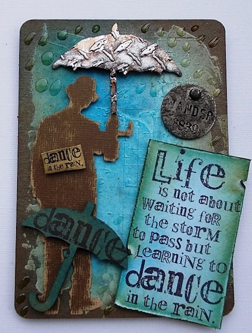 Tracy had this to say: This is one die I have actually never used and thought it was about time to correct that situation and the water challenge seemed the perfect opportunity. Metal Foil Tape has been textured using the Riveted Metal Texture Fade to add a little more interest to the umbrella. Wendy Vecchi’s White Embossing Paste adds the all important texture to the background and Glossy Accents give me my water droplets. I don’t think I have ever danced in the rain, maybe I should try!