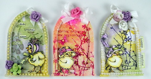 Suzanne had this to say: The bright happy colors of the background made me think of Easter eggs and springtime. I made a beautiful set of Spring Themed Arches. To create the arches I used the Poppy Stamps – Gothic Window Die and die cut out a series of frames from the background papers. To go with the spring theme I used the sweet Stampendous Feather Bonnet Baby and Stampendous Floral Bonnet Baby stamps. I added the flowers from the Stampers Anonymous – Spring Sprung in the background. I am participating in a swap of Easter Arches and can’t wait to share mine.