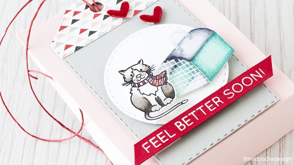 The sentiment from More Sketchy Banner Greetings fitted in with the theme of someone or a loved pet being under the weather. I stamped the greeting in Versamark and white heat embossed on Schoolhouse Red card. To gather all the elements together I cut a stitched tag from Smoke card with a patterned paper top, added a white Stitched Circle and then foam mounted the cat, carrier and sentiment. I also added a couple of Schoolhouse Red hearts cut with the Stacked Heart die and coated with Glossy Accents. This die cut lots of hearts and the same time so I’ve plenty for use in the future.