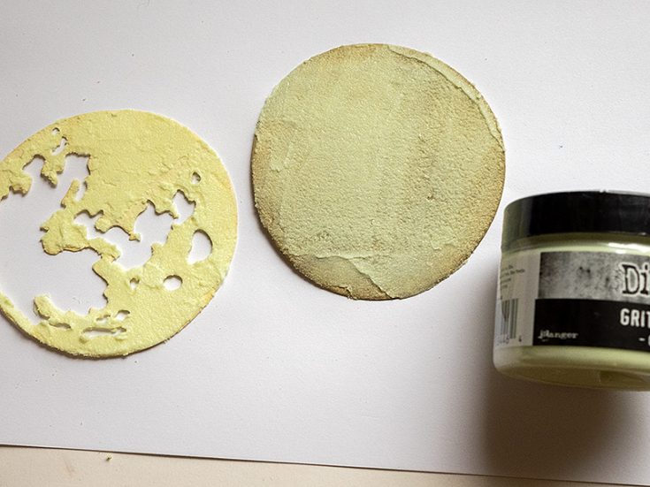 Apply Glow Grit Paste to the moon with a palette knife. I tested the Glow Paste on a whole bunch of inky backgrounds first to see how the ink colors would affect the glow. Different colors and shades of ink give a different effect to the Glow Grit Paste, since the paste will pick up some of the ink. Thus, you can create a very cool shadow glow effect on the moon.
