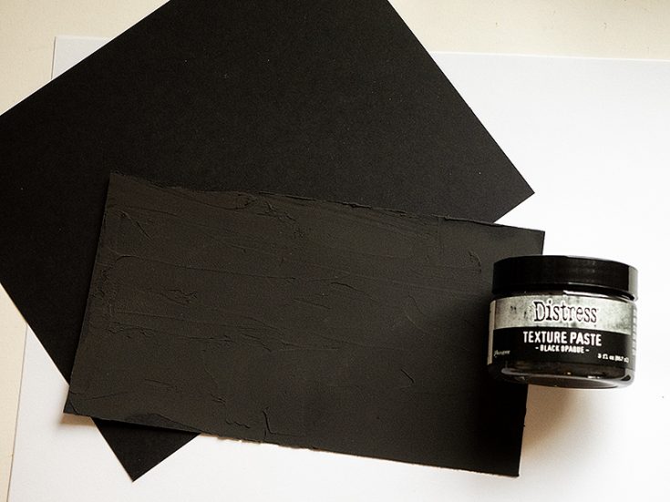 Apply a thin layer of Black Opaque Texture Paste to Simon Says Stamp black cardstock. Let dry.