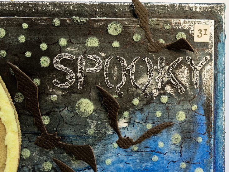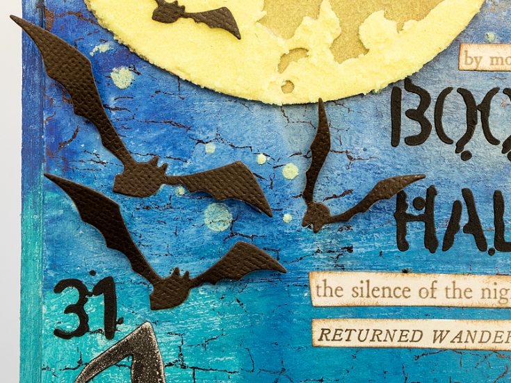 Die cut bats from the Moonlight die set from black kraft stock paper. Shape a little and glue to the background.