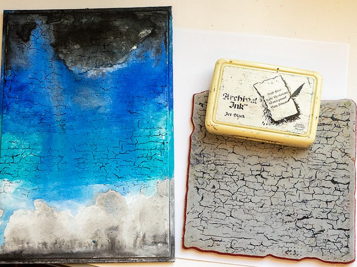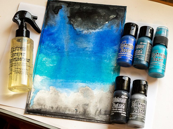 Paint with Distress Paint using blue shades combined with grey and black. Mist with water to blend.