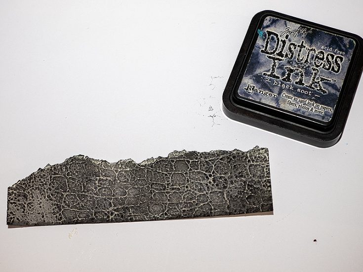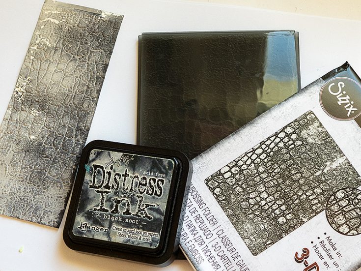 For the ground, cut a piece of watercolor paper. Smear Black Soot Distress Ink on a non-stick craft sheet, mist with water and press the paper into the ink. Immediately emboss in Tim Holtz Reptile folder.