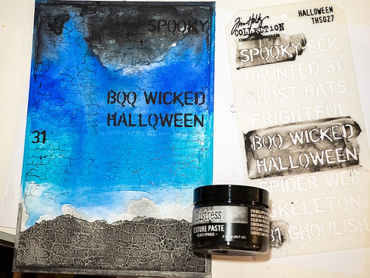 Apply Distress Black Opaque Texture Paste through some of the words on Tim’s Halloween stencil. Mask off the neighboring words with Simon Says Stamp Very Very Low Tack tape to avoid getting paste there.
