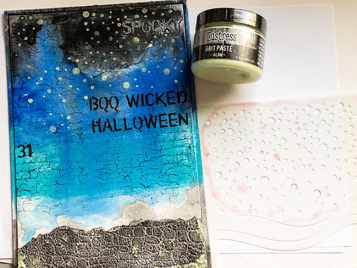 As a child I had two small glow-in-the-dark figurines next to my bed. I was very fascinated with them and still like glow-in-the-dark items, which is why I was happy to see Tim Holtz new Glow Grit Paste. This stuff is so cool! I created a trick and treat scene on my project with several different details which glow.