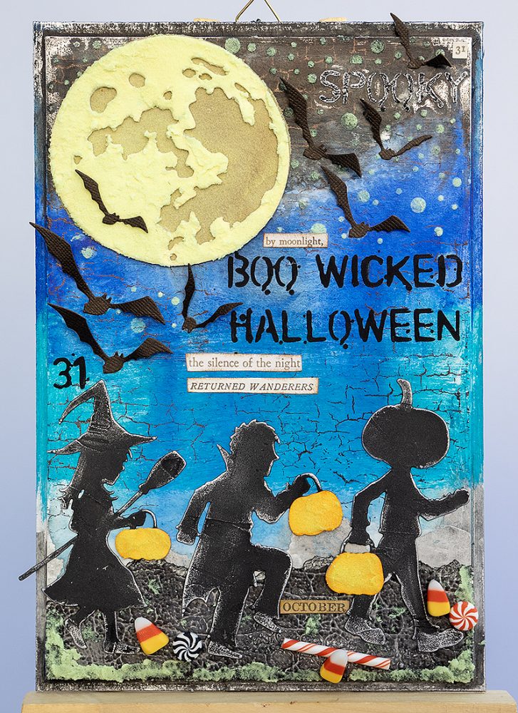 Die cut the three Halloween Night silhouettes from the paste paper. This will give them an interesting texture. Let dry.