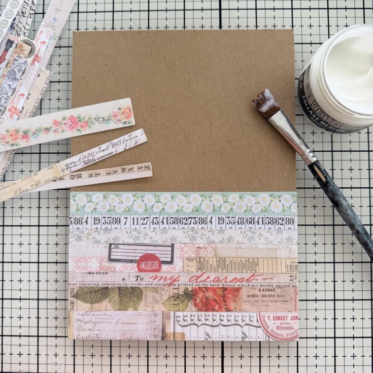 • Use Collage Medium to add idea-ology Paper Strips to a small Rectangle Etcetera Panel. Paper Strips are fun to use because there are so many patterns, colors and really, no wrong way to use them! Choose the strips you like best and adhere them to the panel with Collage Medium. Since Collage Medium dries quickly, I find it’s best to add Collage Medium to the back of each Paper Strip, rather than the panel itself.