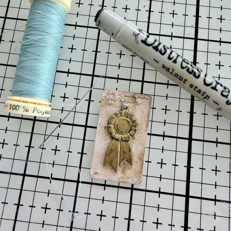 • Scribble over prize ribbon with a Walnut Stain Distress Crayon. Rub crayon with thumbs to disperse, giving it an aged appearance. Choose a piece of ephemera from the Snippets Field Notes pack and add the prize ribbon to the front with a spot of Collage Medium. Use a needle and thread to stitch the metal loop to the ephemera.