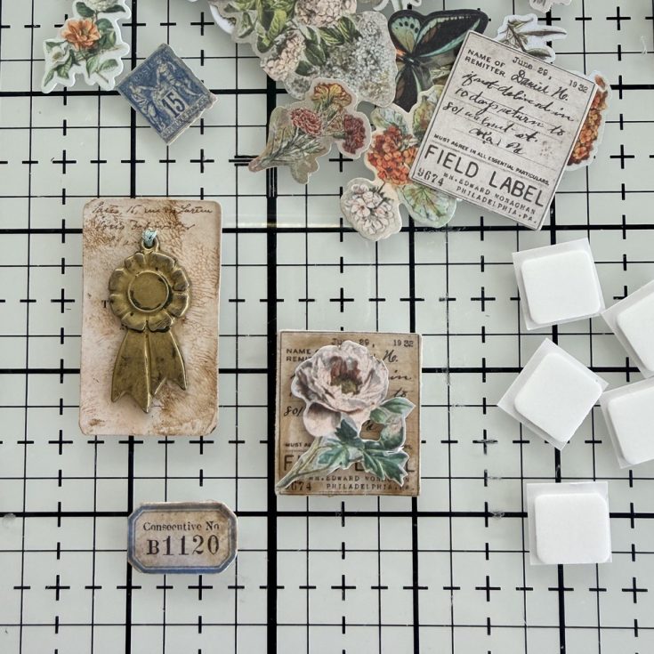 • Choose a few more pieces of Snippets ephemera to go into the collage. I fussy cut another flower and added it to an additional piece of ephemera with a Thin Foam Square.