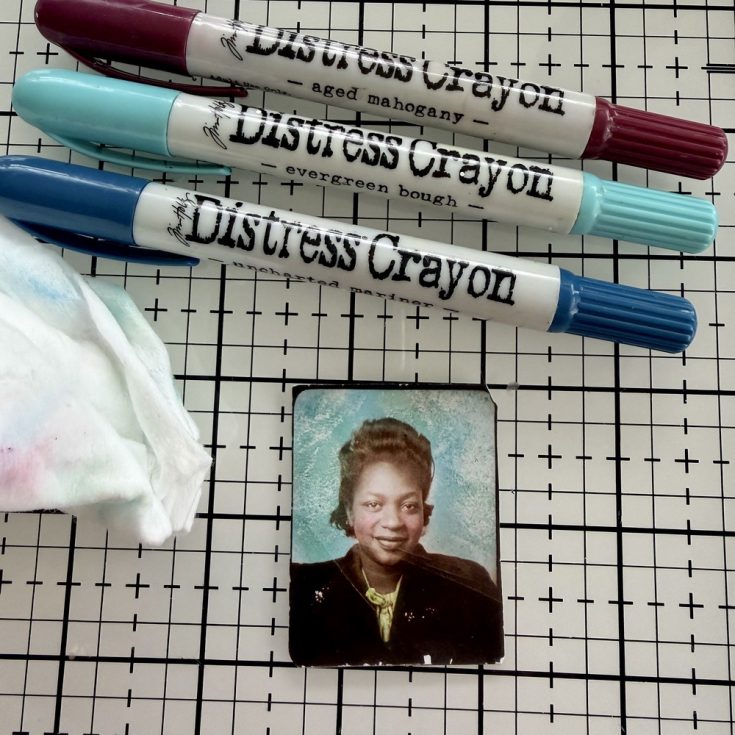 • Choose a Photobooth image to use (or a personal image 1.5 x 2”). If you are using an idea-ology Photobooth image, use Distress Crayons to tint the image by scribbling on a bit of crayon, then rubbing with your fingertip. The creamy crayon will tint the surface of the image. If you get too much color or you want to change the color, just wipe the crayon off with a wet wipe and dry with a heat tool before starting again. I used a cotton swab to tap the crayon color, Aged Mahogany over the cheeks. Optional: Use a wet wipe to muddle the crayon background to make it look more aged.