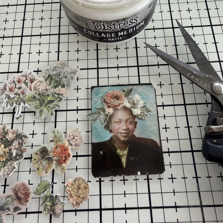 • Use Mini Recoil Scissors to fussy cut a few flowers from the Snippets Field Notes ephemera pack. Add Collage Medium to the flowers to make a layered floral crown over her head.
