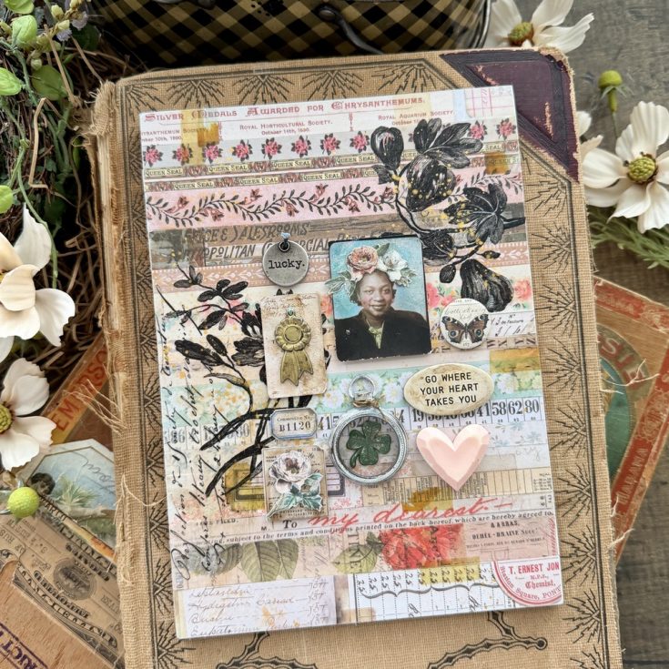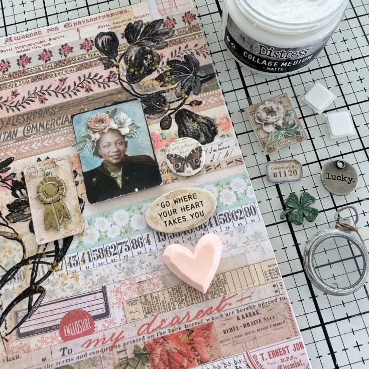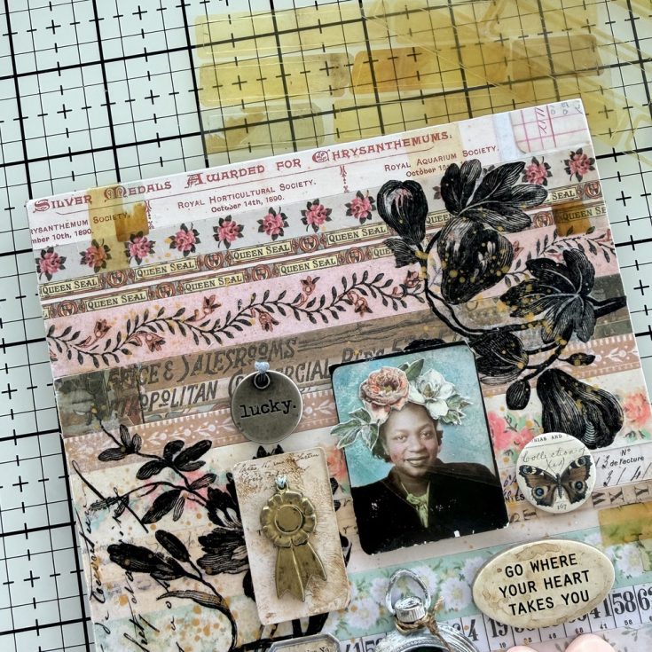 • Gather all the embellishments plus a few extra, like the Lucky token from the Adornments pack, a butterfly Mini Flair and a sentiment from the Quote Chip Labels. All pieces were added with Thin Foam Squares, with the exception of the Salvaged Heart, Mini Pocket Watch and Clover. They were adhered with Collage Medium.