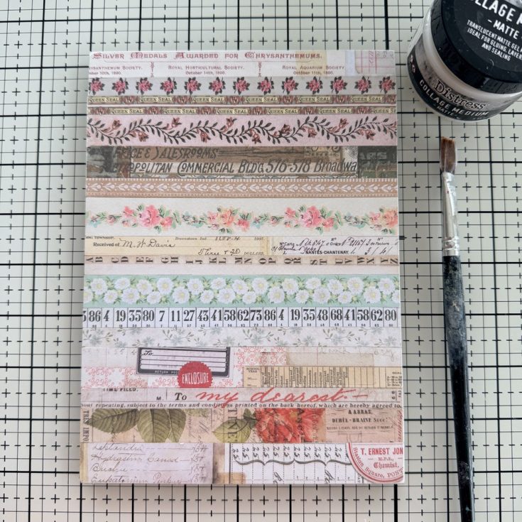 • Once the Etcetera Panel is covered with Paper Strips, add a thin coat of Collage Medium over the top. Again, Collage Medium dries quickly over paper so work quickly, then use your hand to rub the Collage Medium into the paper so you get a very thin coat over the top. Set aside to dry.