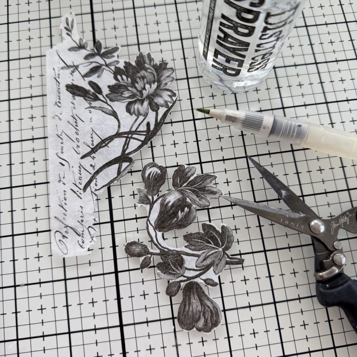 • idea-ology Collage Paper comes in small 5 x 6”sheets. Choose one or two designs to add to the panel. I went for a darker floral design that will easily show over the Paper Strips. I used two different methods for cutting out the designs: One piece is fussy cut and the second I used a combination of fussy cutting and a Detailer Water Brush to remove the unwanted portion of the paper.