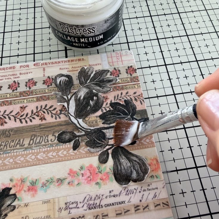 • On the right side I added the fussy cut Collage Paper by adding Collage Medium to the surface, pressing the image into it, then using a brush to add more Collage Medium over the top.