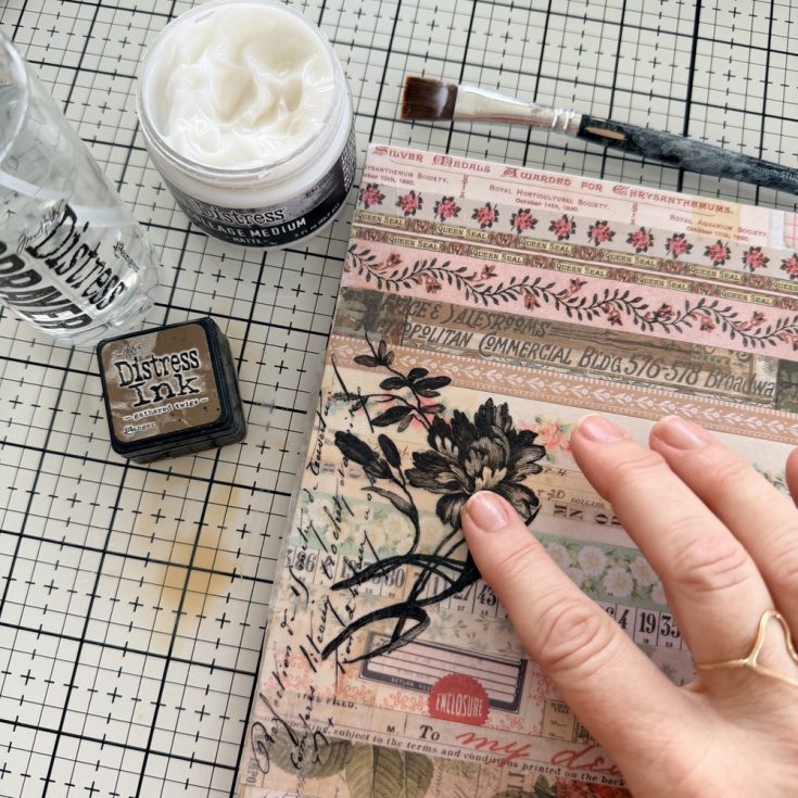 • On the left side, I repeated the same steps but added one more. I made a puddle of Gathered Twigs Distress Ink and water on my Studio Glass Mat. After I added the Collage Medium to the top of the image (and while the glue was still wet), I used my fingertip to dip into the puddle and lightly rub over the surface.