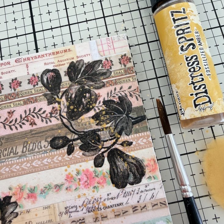 • If you work quickly and the glue is still tacky, use a brush to flick Distress Spritz in Fossilized Amber over the surface. I like the control of the using a brush, rather that spraying directly from the Spritz bottle, but either way will work. Set aside to dry completely.