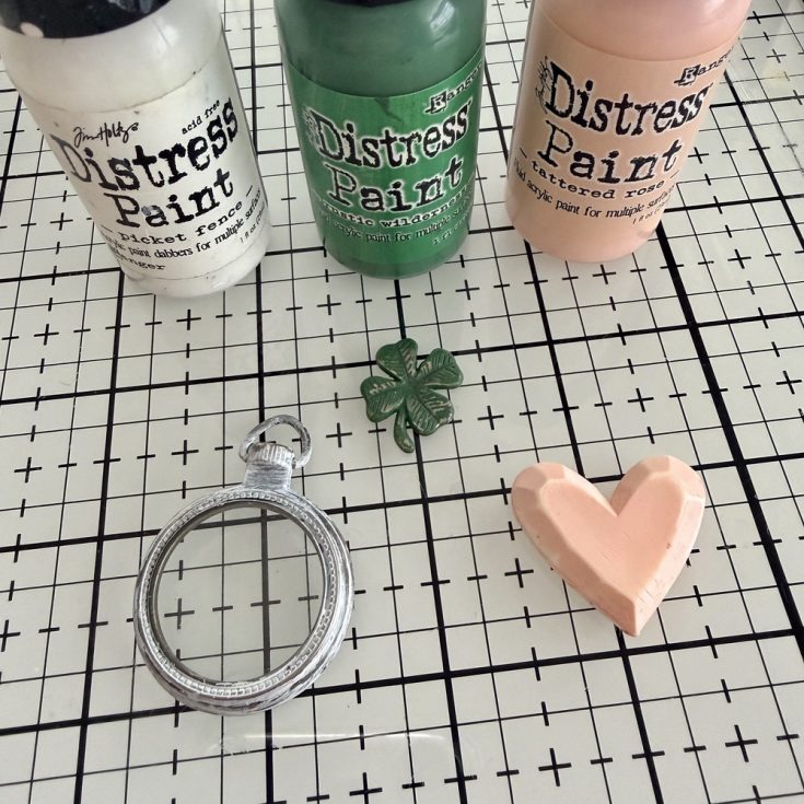 • Use Distress Paint to color embellishments. Picket Fence on the Mini Pocket Watch, Rustic Wilderness on the clover, and Tattered Rose on the Salvaged Heart. Note: Use needle nose pliers to remove the ring at the top of the clover before painting.