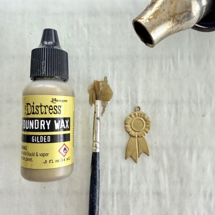 • Shake the Foundry Wax bottle till you hear the mixing ball. Squeeze a dime size puddle onto a disposable paper. Use a small paint brush to quickly paint the Foundry Wax over the metal prize ribbon (Lucky Adornments). Remove the Foundry Wax bottle and brush from the area, then heat the Foundry Wax with an embossing tool till the matte finish turns shiny gold. Note: For easy clean up, use Isopropyl Alcohol on paint brush and on work surface if using a glass mat or craft sheet.