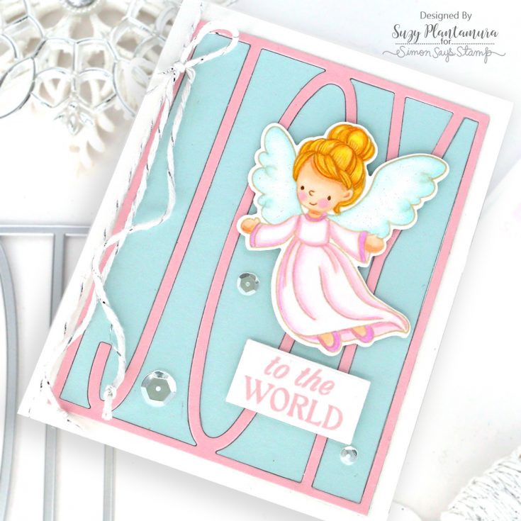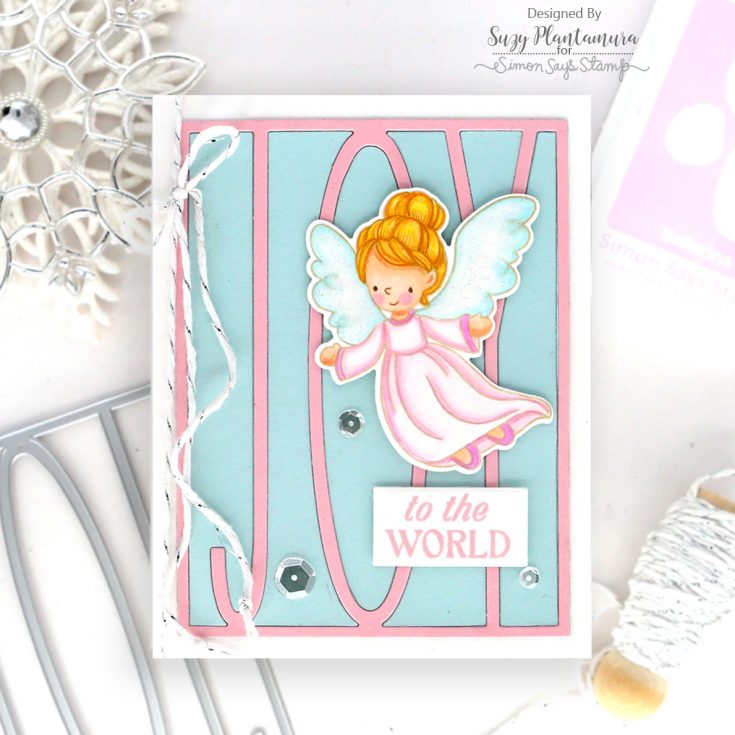 I die-cut the Joy Cover Die from light pink and light blue cardstock. I glued them to a white card base using two of the frames, so the inside pieces were flatter looking “inlaid”. I attached the angel to the top right cover and the sentiment below her. I tied some white and silver twine around the left side of the card and added 3 sparkling clear sequins.