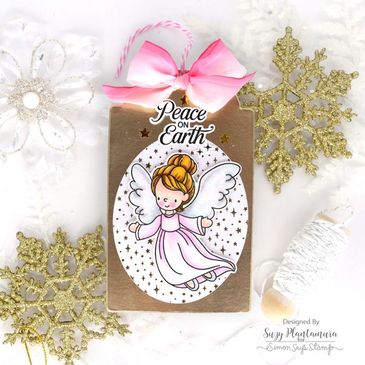 I stamped the angel and the Peace on Earth sentiment with black ink. I colored her in with Copics and then applied White Blizzard glitter drops on the wings. I added her with foam tape to the top of the oval and the sentiment above the oval. I added 3 gold stars from the Mini Star Embellishment Mix. I tied a piece of twine through the hole and then attached a large bow over it.