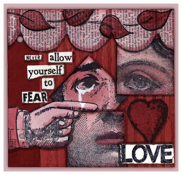 Dan had this to say: Asking me what my favourite ink pad is is like asking me what my favourite food is – there’s more than one answer and it changes regularly! Having said that, thinking back through my crafting life it came down to a choice of two – Gathered Twigs and Fired Brick Distress Ink Pads. I use Gathered Twigs most of all, but as an accent and distressing colour. Fired Brick is the one that I actually use when I want a blast of rich colour in a composition so it won out here. I decided to challenge myself and use only that inkpad for the whole piece, apart from some black for stamping. I used several stamp sets on this page, including Valentine Blueprint, Around the Edge, Mona’s Sketchbook and Rockstar.