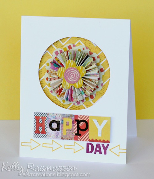 Just look at this beautiful card Kelly made using BasicGrey‘s Soleil. I like how she layered with the wheels and petals. The arrow stamps are from the Paradise set and the letters alphabet stickers can be found in here!