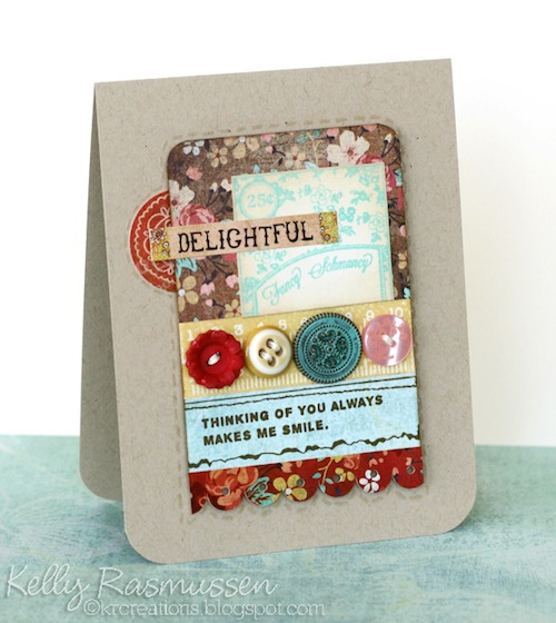 The vintage buttons on this card make a cool border and coordinate perfectly with the pretty Lucille papers! I like how Kelly rounded the corners on the card and mirrors it on the floral paper. The half circle peaking from behind the floral paper mirrors the buttons. I love this technique! Plus she mixed and matched all three clear Lucille stamp sets: Be Silly, Fancy Schmancy, and Sew Perfect. This is such a put-together layout!!