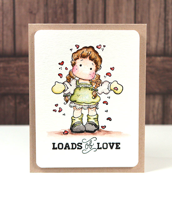 Like we shared a few days ago, brand new Magnolia stamps are now available! I adore this little Love is In the Air stamp with Tilda and the falling hearts. She’s so cute! I thought the stamp image would go so well with the “Loads of Love” sentiment from Just a Love Note stamp set from Simon Says Stamp.