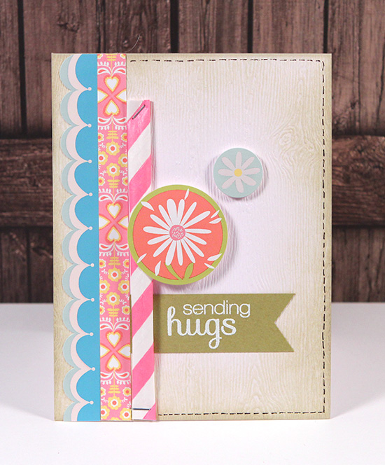 The kit includes a sheet of white woodgrain texture cardstock. To make the texture stand out, I used a bit of Tim Holtz Distress Ink in Antique Linen (not included in kit) to blend in a bit of color on the edges. I also flattened the pink straw and stapled it to the front of the card. The straw adds a ton of dimension!