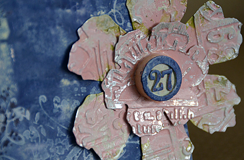 2. Adhere a foil sheet to cardstock, then die cut flowers. Emboss these in texture fade and paint with Victorian velvet distress paint. Accent with peeled paint distress paint if desired. Once dry, sand off some so that a bit of metal shows through.