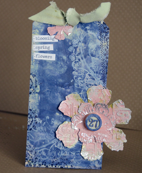 1. Blend sapphire and sage distress paints to create the background. Then stamp (with sage) flourishes onto the tag.