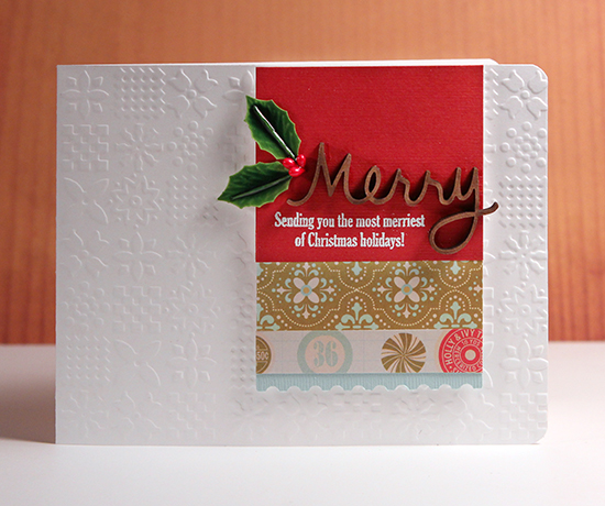 This is a pretty quick and easy card, and it uses two of the unique items in the kit: the holly berries and leaves and the Merry Art Part. I loved pairing these items together. The space right next to the M on Merry was begging for some embellishment, don’t you think? :)
