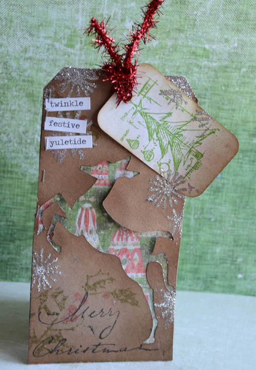I die cut the deer into the kraft tag, then I stamped onto the tag, and I also mounted it onto a piece of patterned paper covered with Tim’s frosted film. I used my beloved sticky embossing powder to add some glittery bursts around the tag, and topped it with some tinsel (love that stuff!) as well as a tiny tag stamped with my favorite blueprint stamp.