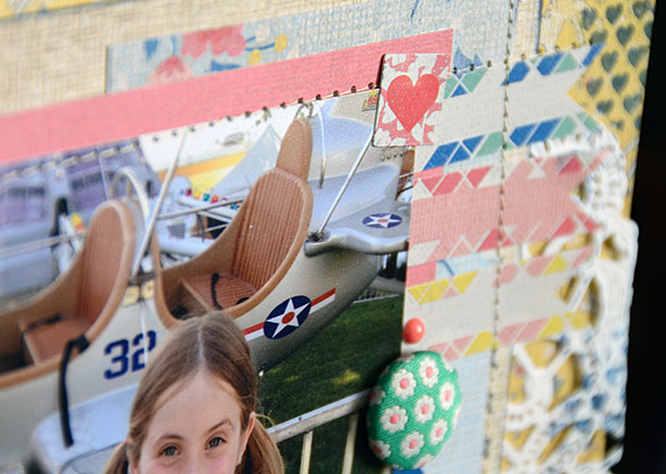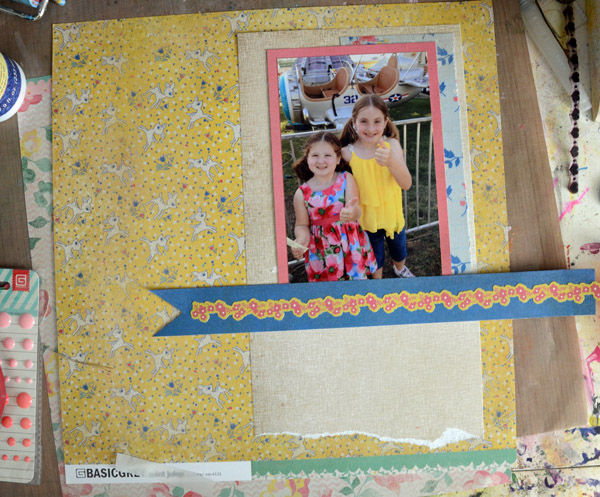 Here is the finished page. You can see I added a doily, but everything else is from the BasicGrey line. To have a playful time and add a lot of small accents without overwhelming my photo and taking over the whole page, I confined myself to playing along the right side of the photo, and just a few accents below and to the left.