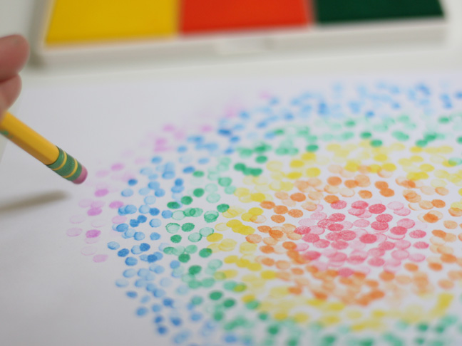 The website Babble had an article from Liz Stan about doing these Pencil Stamping activities with your kids! It’s a great way to get them into colors and the idea of stamping- without giving them your precious stamps you use for your projects! (Plus, one thing I remember from being a kid, is I loved taking something used for one specific thing.. and using it for something completely different! Imagination is King!)