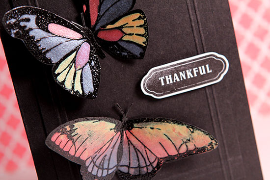 Plus, it’s virtually impossible to mess up and paint outside the lines because the embossing powder “pushes” all the Perfect Pearls back within the lines. My kind of painting! LOL! You can see it best on the butterfly at the top of the card.