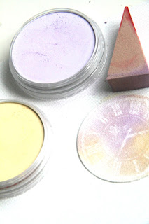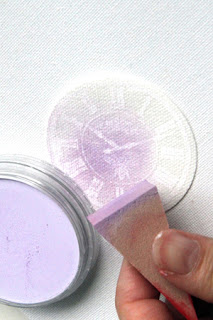 7. Apply PanPastel’s Color onto canvas clock (Yellow Ochre Tint and Violet Tint were combined here). For more intense color , start with the Violet tint and then applied Yellow Ochre Tint.