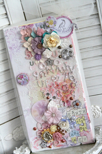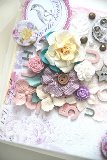 4.Cut pattern motif from pattern paper. Adhere to top and bottom right hand corner of the canvas. Do not discard remaining pattern paper. Tuck under doily. Paint a layer of gesso over the motifs.