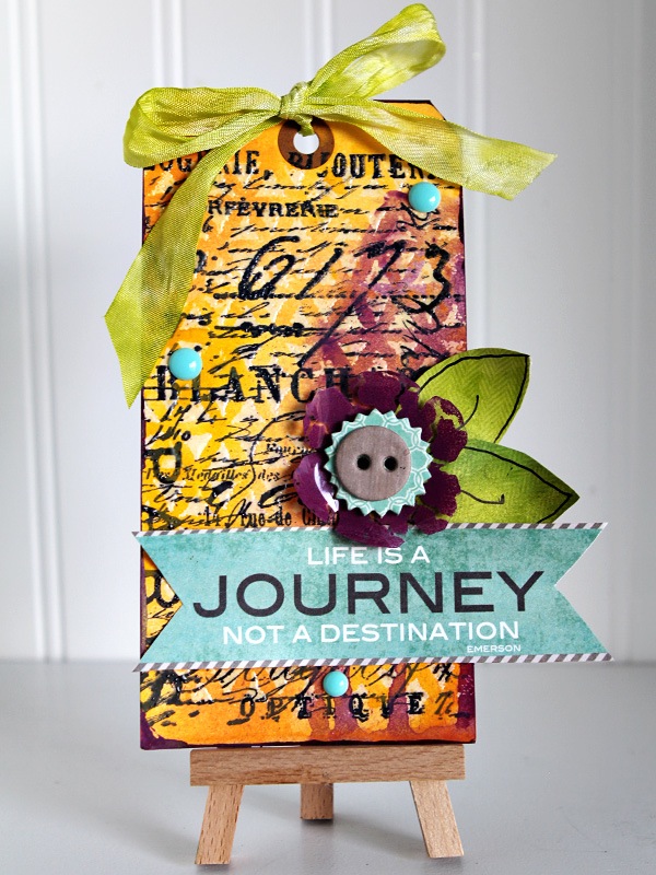 After distress the edges of the tag, I used the same stamp, Tim Holtz Papillon, I used in the Journey tag but I stamped off the ink to create a lighter image.  I die-cut some more shapes out of the clearly for art, this time a Sizzix/Tim Holtz Heart Wings Die.  On the heart I used my subway stencil, this time painting the stencil with distress paint and then stamping it onto the heart to get the reverse image.  I painted the wings using distress ink in a sweeping motion to create the streaks on the wings.  The little flowers are shrink plastic die-cut flowers to match the wings.  After placing the heart on the tag, I added some layered buttons & brads, a metal word band, and a small heart brad.  I love a pop of black so I tied some twine at the top to finish the tag.