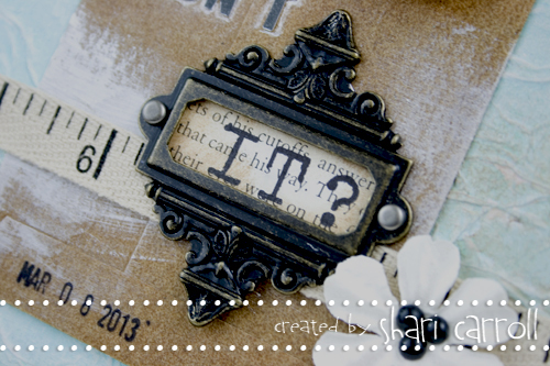 Hi Bloggers! Happy Friday to you! We are BACK with the amazing Shari Carroll and our 3rd installment in a monthly 2013 series of Art Journaling features! Shari has provided us with another incredible inspiration this month! I love how versatile each one has been! If you missed either of the first two, feel free to check them out HERE & HERE. Otherwise, enjoy the detail close ups below and take a look at the video to be truly inspired!