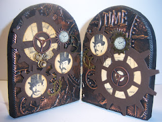 Linda used the Kabuka Mold #7 by Ten Seconds Studio!  She also used the Gadget Gears die by Tim Holtz for Sizzix, a cutting machine, the Steampunk Cling Rubber Stamp Set by Tim Holtz, and Sprocket Gears Idea-ology pieces!