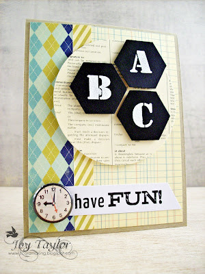 Joy used a Sizzix Hexagons die and a Stencil Alphabet stamp with white embossing powder & embossing ink. She also used products like: 9 to 5 paper and a Tin Pin from October Afternoon, & a Paper Trimmer (I just bought one of these, myself!). You might also need a machine like the Big Shot for this project. If you’re like me, you find it impossible to cut the perfect circle…BUT, it can be done with this.