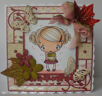 Marcea used a stamp by The Greeting Farm, an edge punch like Scallop Sentiment by Fiskars, the Cherry Blossom Trim punch, the Swirly Vine die, Autumn Splendor. I love that Marcea is a problem solver with her crafting – she didn’t have the right color flowers or pearls so she used Copics to custom color plain white flowers and pearls. Do you love the papers she used? I do! They’re Beautiful Moments by Carta Bella! To tie it all in together, she added some sparkle!