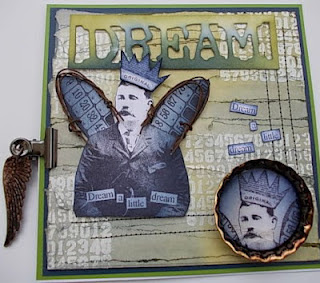 Tracy used a Mega Bottle Cap, edged in gold (try a paint dabber!), the Dream a Little stamp (you can also do this with a Stamp2Cut No. 2 Cartridge), the Dream die by Tim Holtz for Sizzix, and a nice wing like from Regal Adornments by Idea-ology!