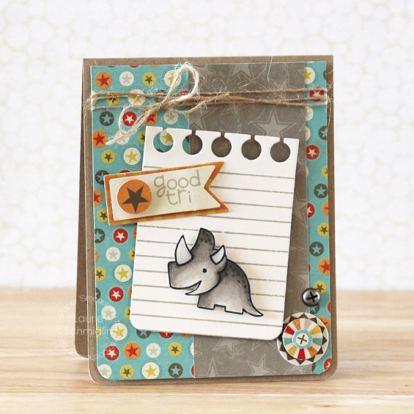 I love making cards for my sons, and when I saw the Boy Crazy paper. I thought it would be perfect paired with some of my favorite Paper Smooches stamps! I cut out the cute notebook paper (using one of my favorite Paper Smooches dies) and then stamped it with the Notebook Paper stamp. I embellished my card using some Boy Crazy Layered Stickers.
